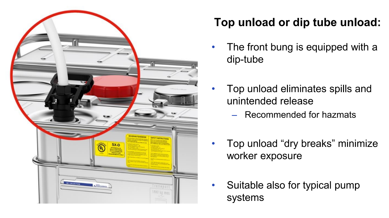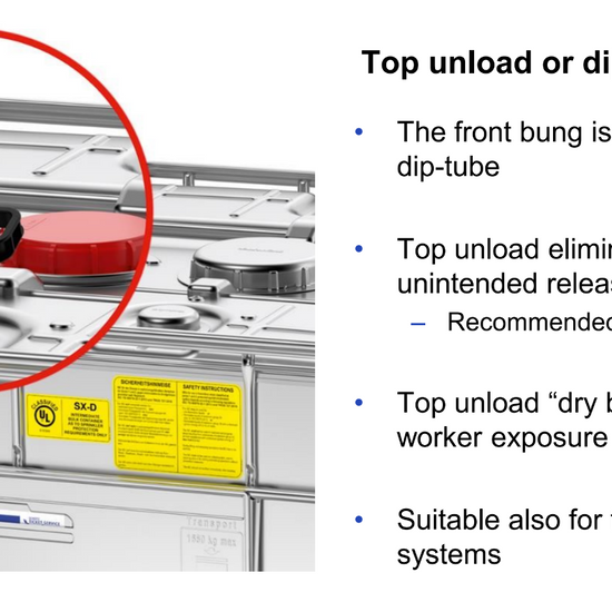 • Discharge: Top unload via dip tube (no bottom valve)